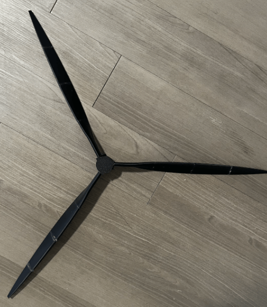 Blade geometry was optimized using X Rotor for the expected operating wind speed. The final design used a blade radius of 40 mm, resulting in a swept area of approximately 0.5 m². Initial testing at the expected wind speed produced approximately 100 mW of power, demonstrating proof-of-concept performance.